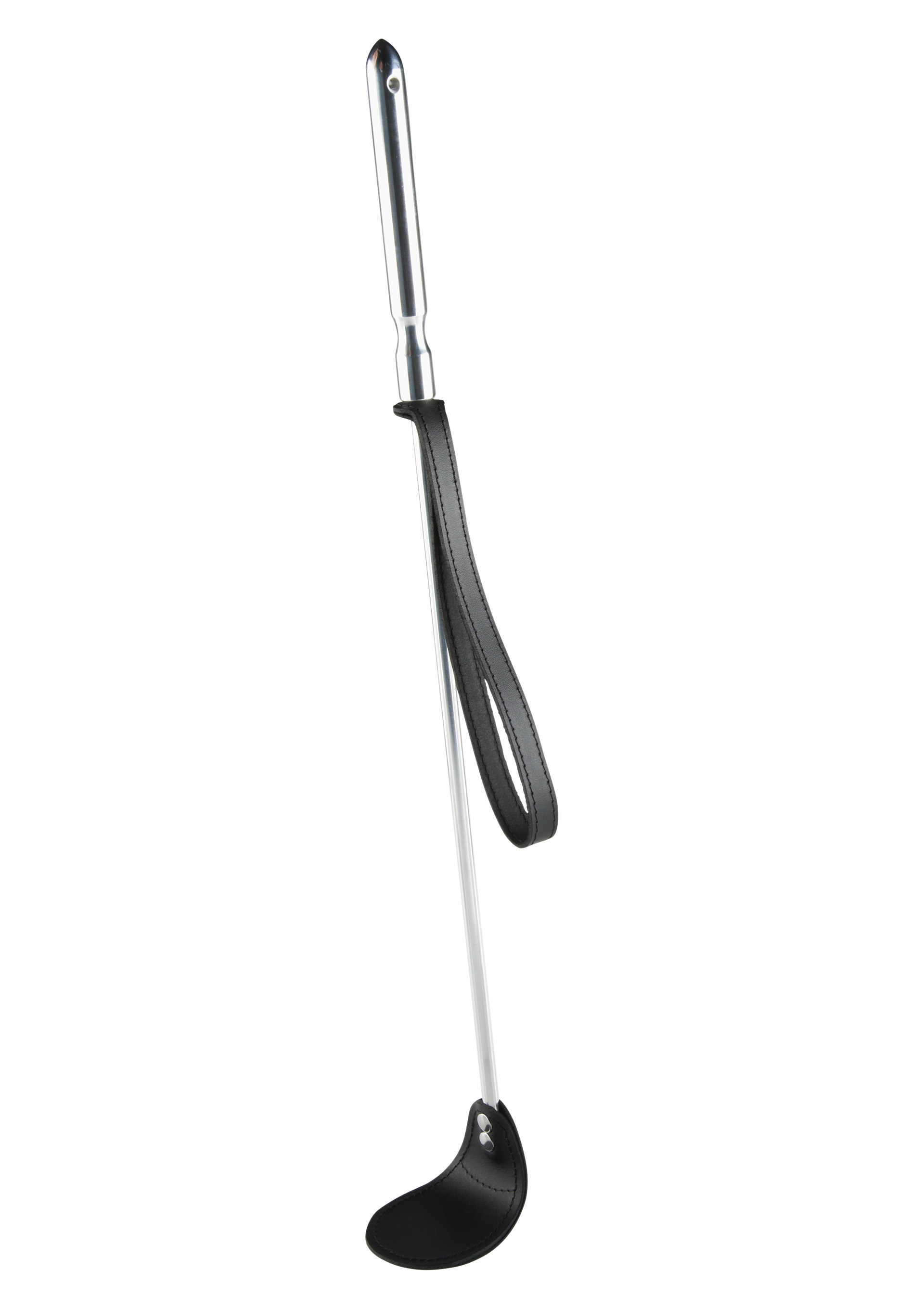 Презентабельная хромированная ручка стека, изготовлена из стали, клапан выполнен из кожи, из такого же материала сделан и ремешок на запястье. Материалы, из которых произведен аксессуар исключительно высокого качества. Строгий лаконичный внешний вид стека полностью соответствует стилистике наказания и подчинения.