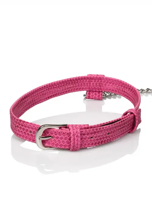 CalExotics Tickle Me Pink Collar w Leash — дизайнерский набор из ошейника и поводка, который добавит нотку стиля вашей игре в спальне. Этот роскошный комплект изготовлен из мягких высококачественных материалов и оснащен регулируемым ошейником с подходящим поводком. Игривый розовый цвет добавит веселья и кокетливости вашим интимным моментам.